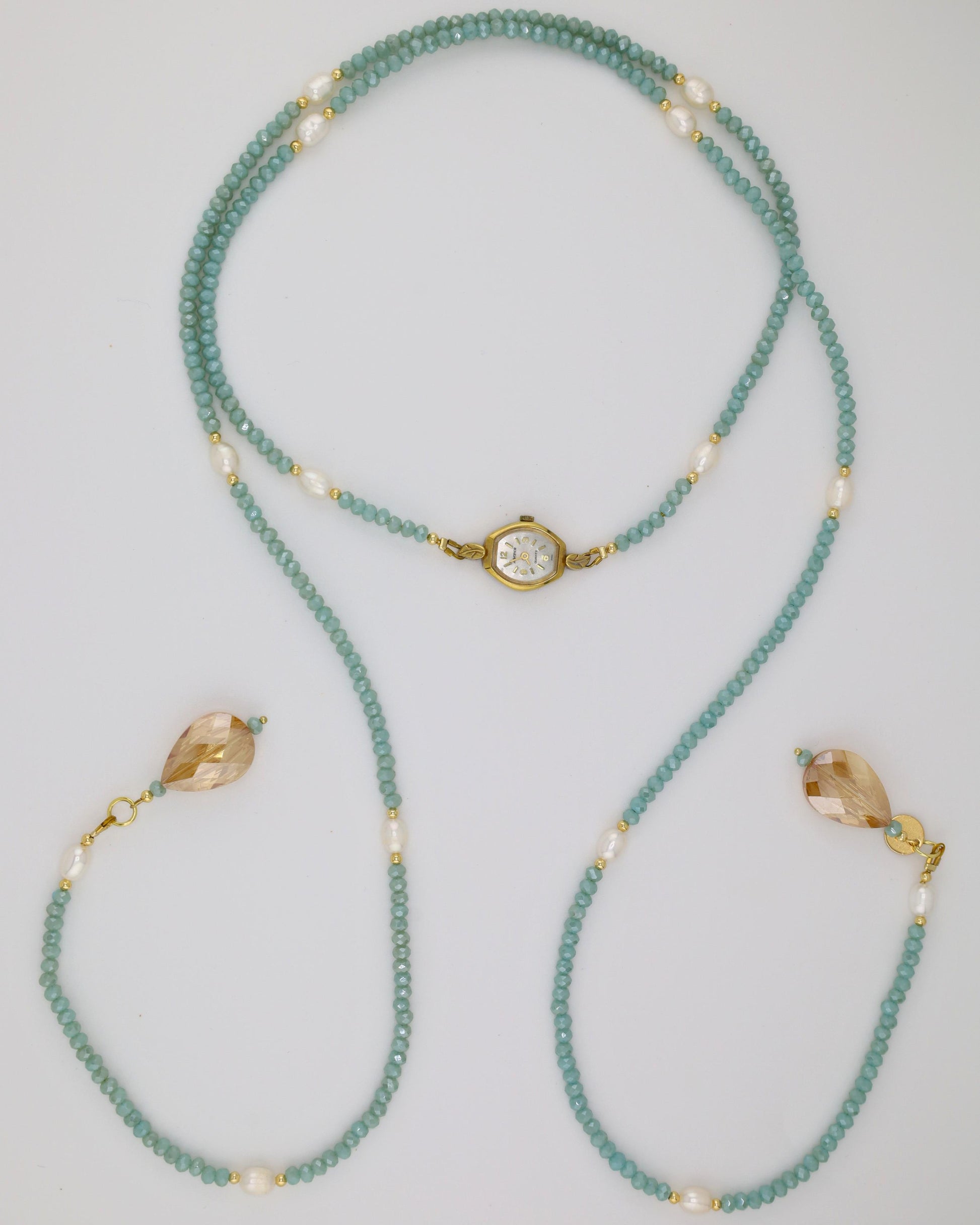 Designed and handmade by us with care, our new Lariat Watch Necklace offers a fresh take on our jewelry silhouettes. Crafted with carefully curated faceted crystals, pearls, and gold hematites, this adjustable necklace features a vintage watch centerpiece, blending function and style in a unique, wearable piece. Its versatile lariat design allows you to layer it or wear it solo, adding a subtle twist to any outfit. Each watch centerpiece has its own character, with minor scratches or imperfections that make every necklace truly one-of-a-kind, just like you.