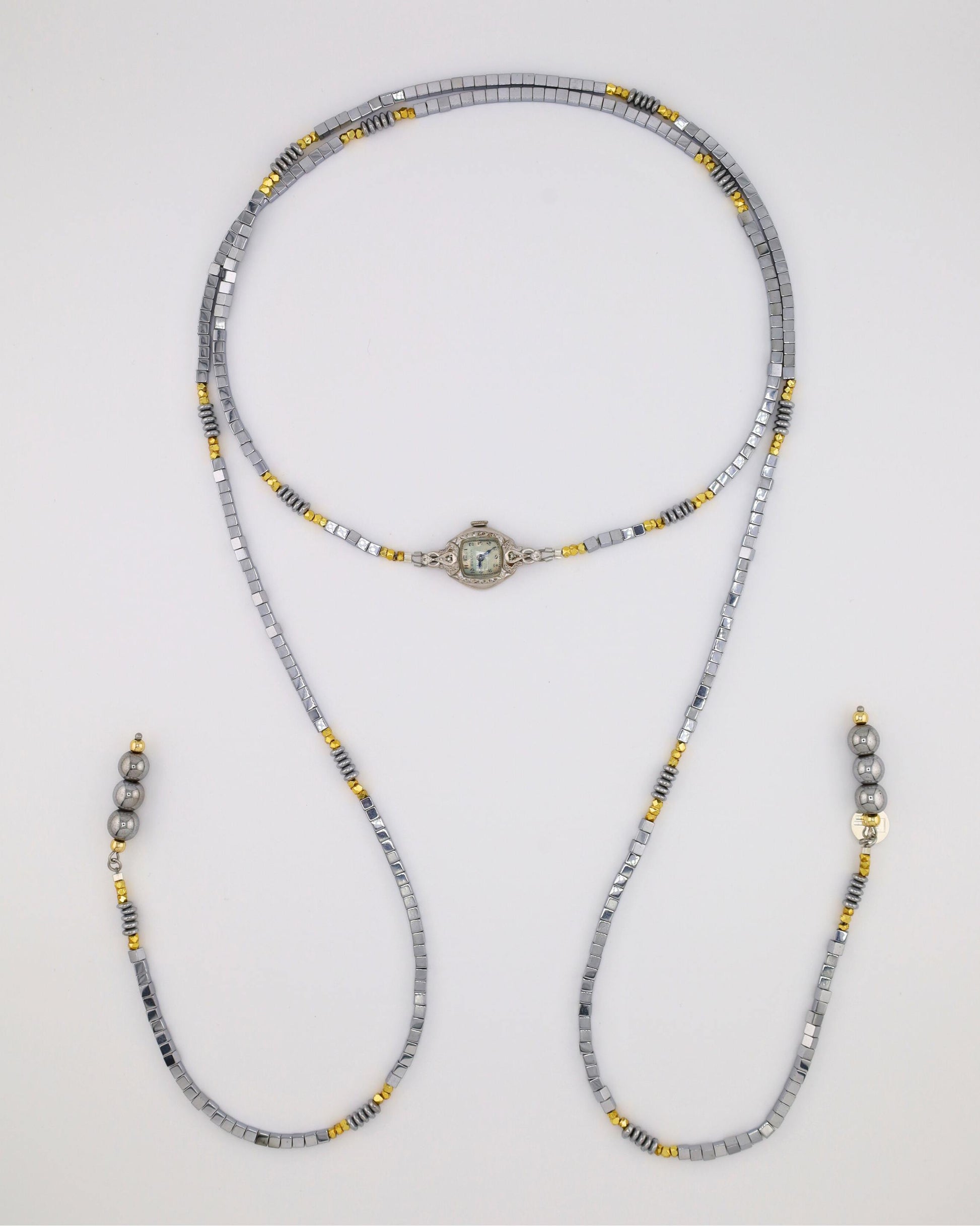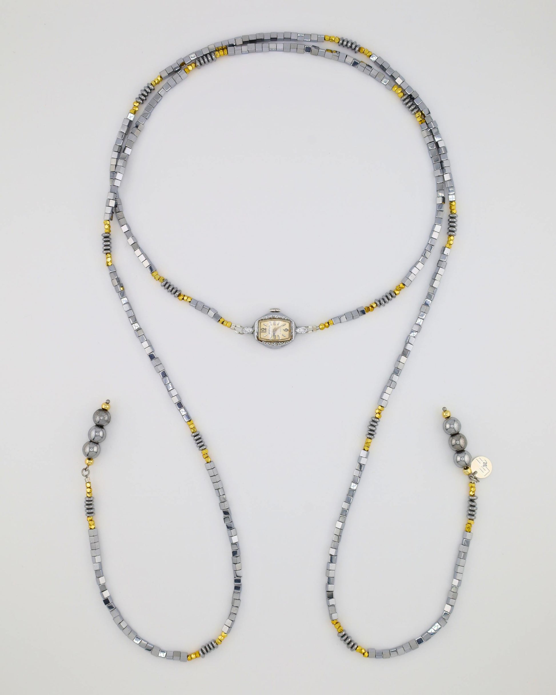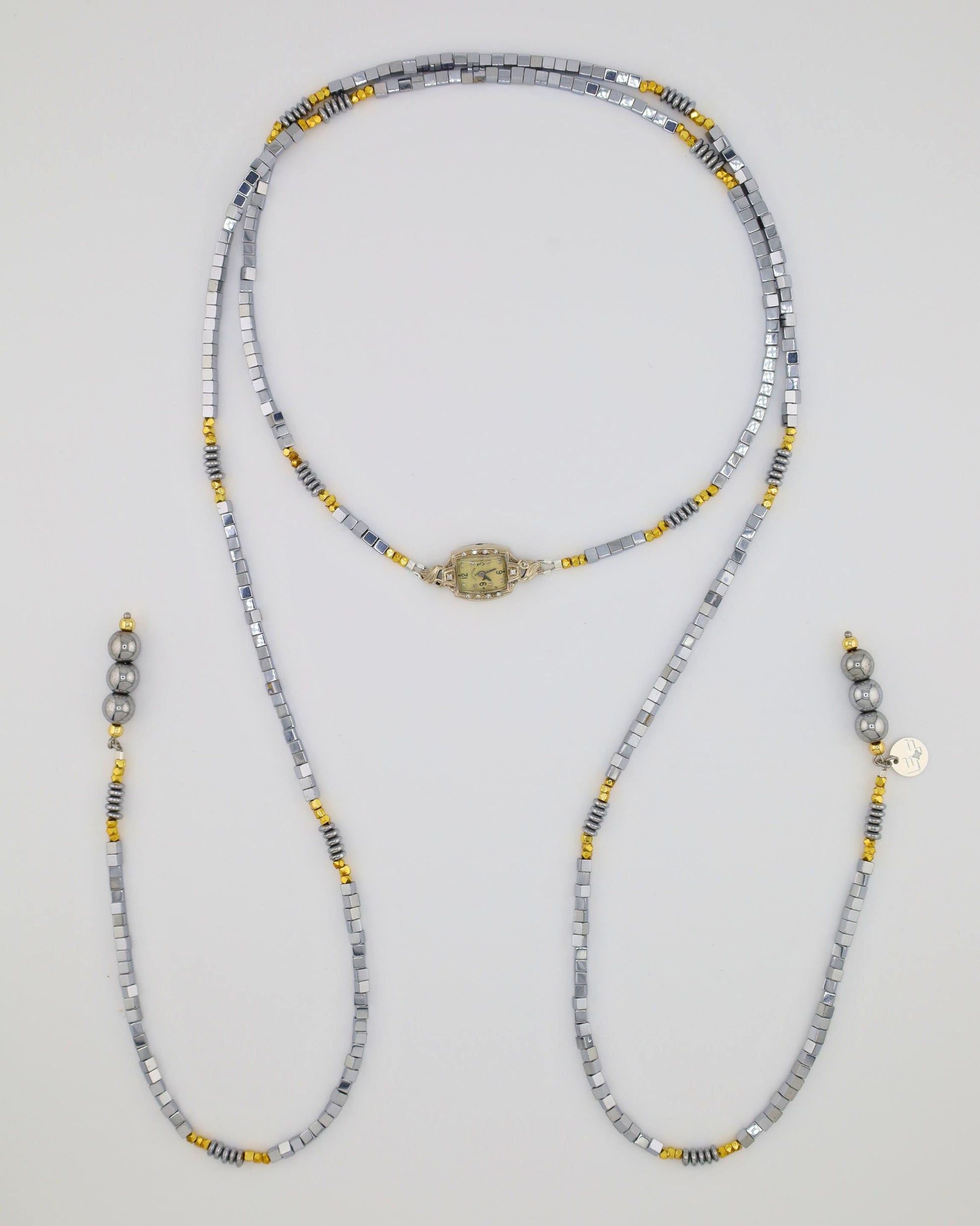 Designed and handmade by us with care, our new Croma Watch Lariat Necklace offers a fresh take on our jewelry silhouettes. Crafted with carefully curated faceted squared and gold hematites, this adjustable necklace features a vintage watch centerpiece, blending function and style in a unique, wearable piece. Its versatile lariat design allows you to layer it or wear it solo, adding a subtle twist to any outfit. Each watch centerpiece has its own character, with minor scratches or imperfections that make every necklace truly one of a kind, just like you.