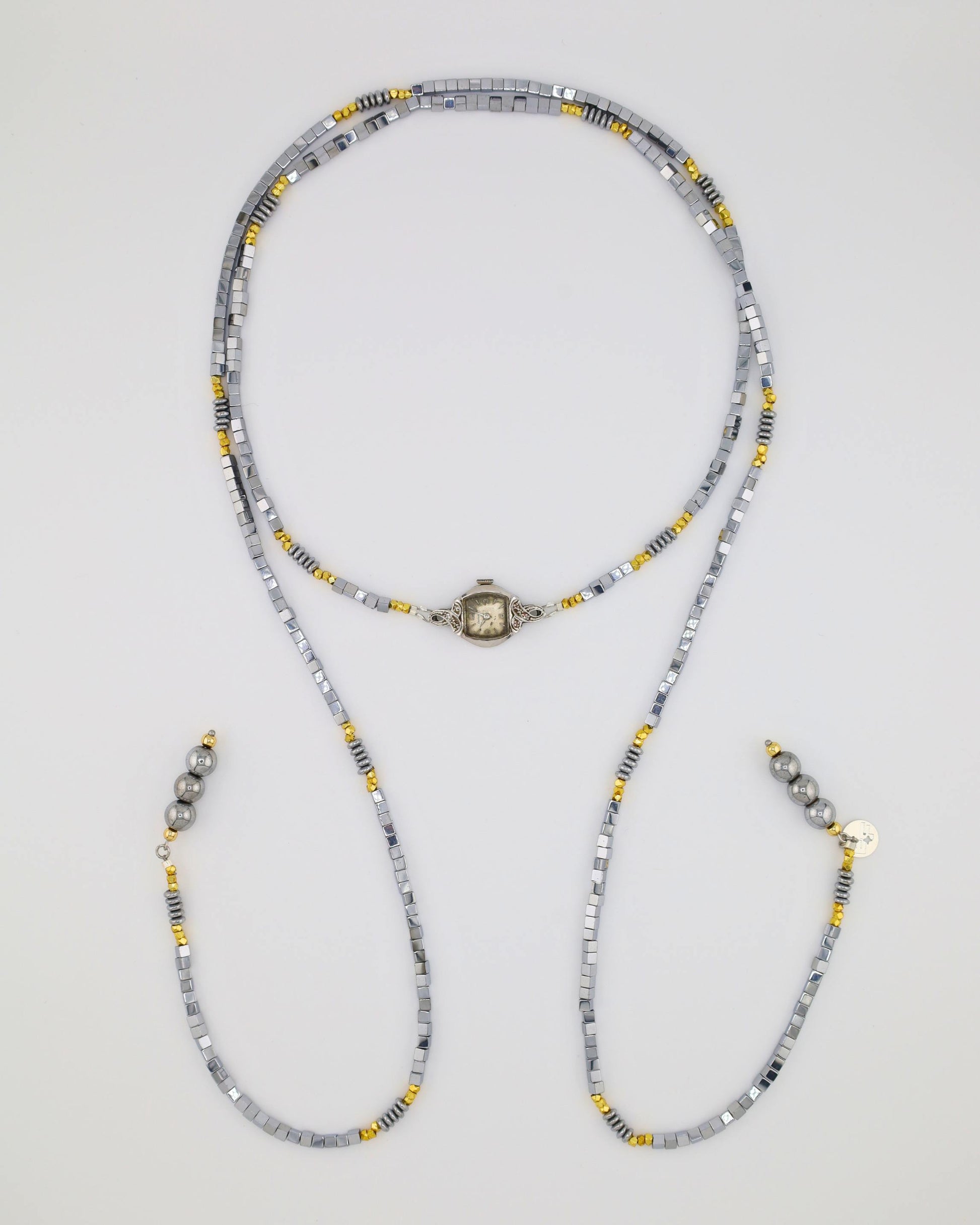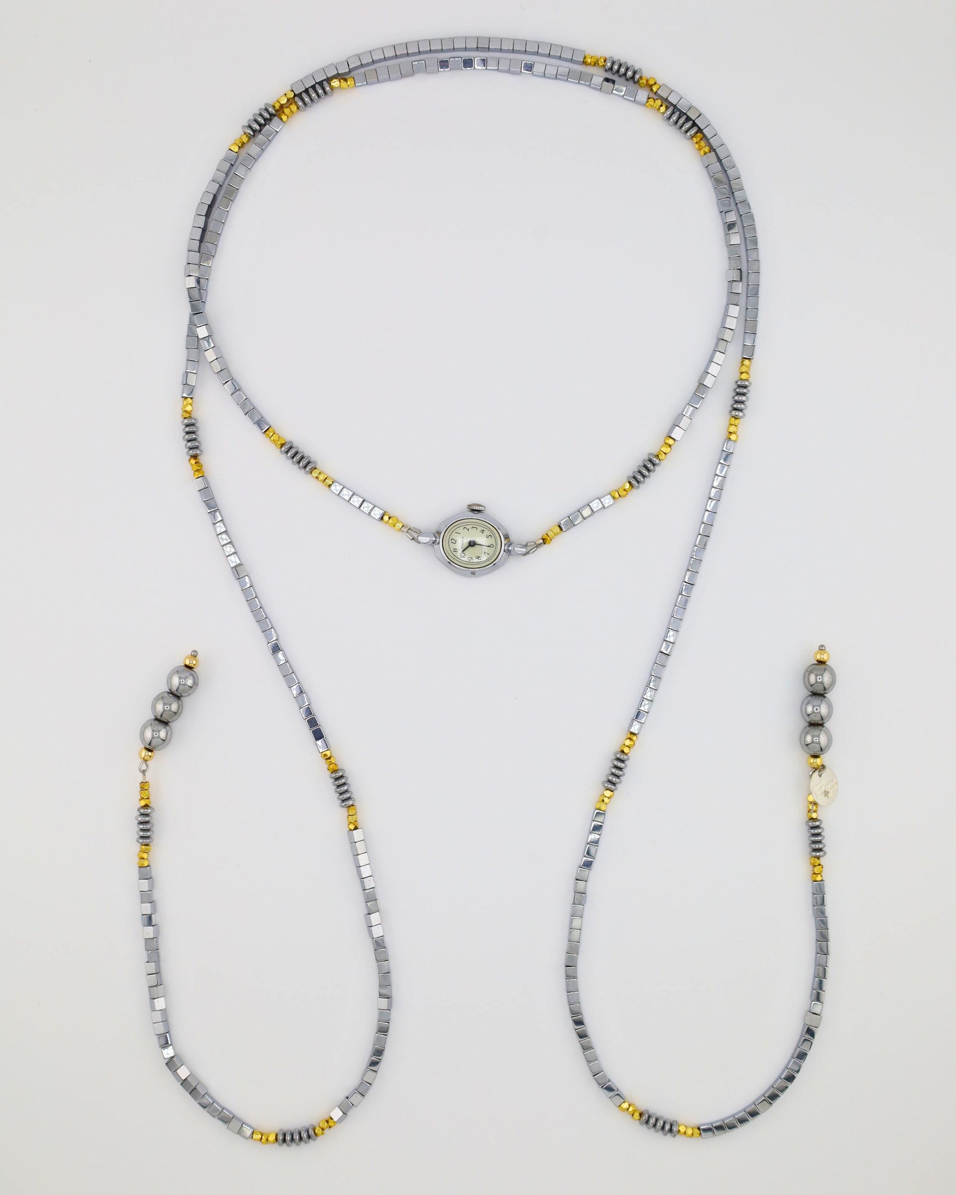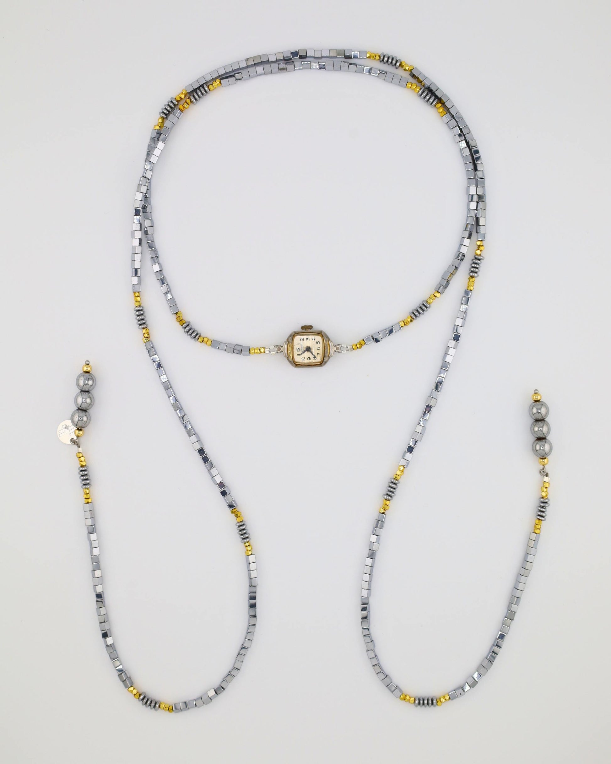 Designed and handmade by us with care, our new Croma Watch Lariat Necklace offers a fresh take on our jewelry silhouettes. Crafted with carefully curated faceted squared and gold hematites, this adjustable necklace features a vintage watch centerpiece, blending function and style in a unique, wearable piece. Its versatile lariat design allows you to layer it or wear it solo, adding a subtle twist to any outfit. Each watch centerpiece has its own character, with minor scratches or imperfections that make every necklace truly one of a kind, just like you.