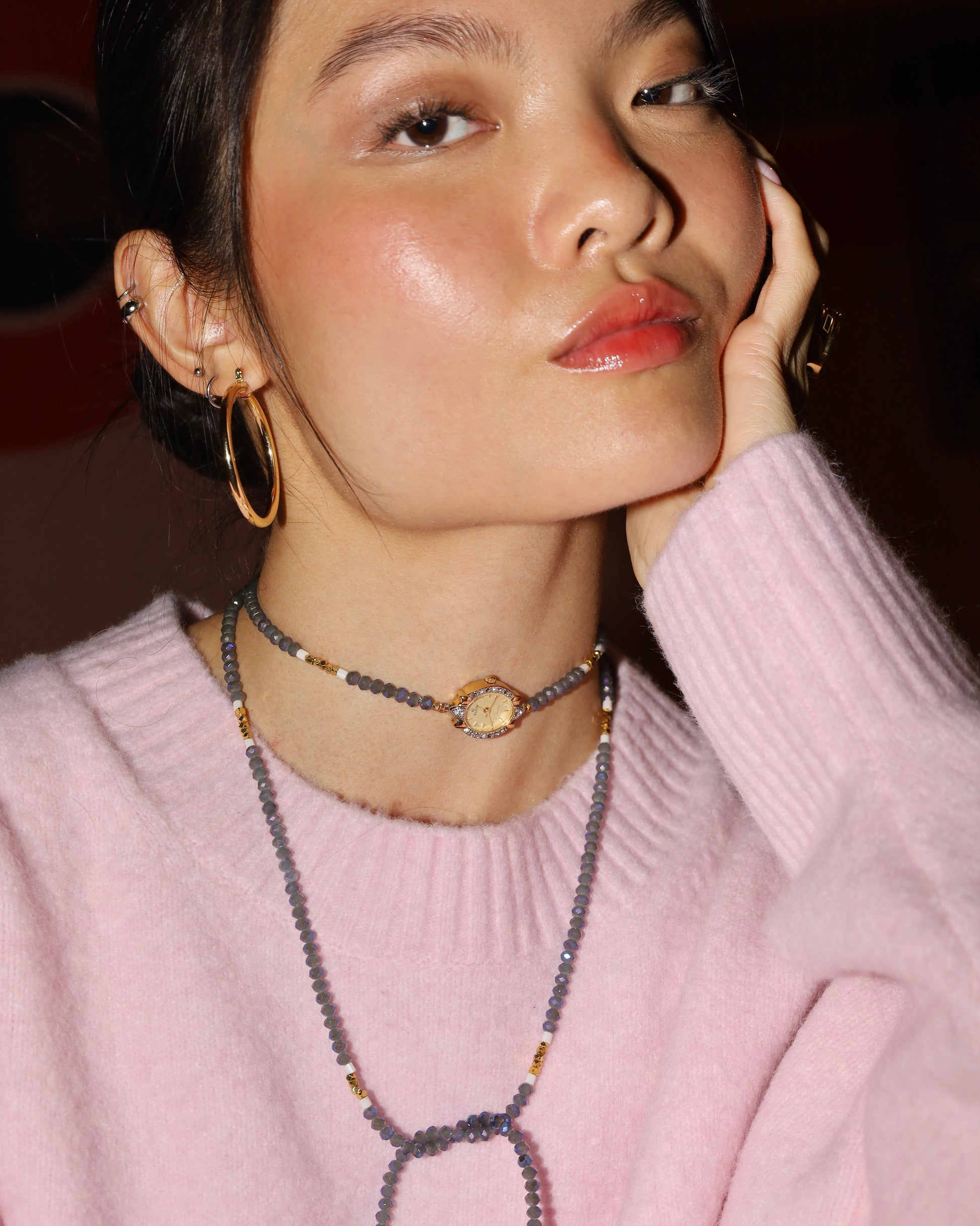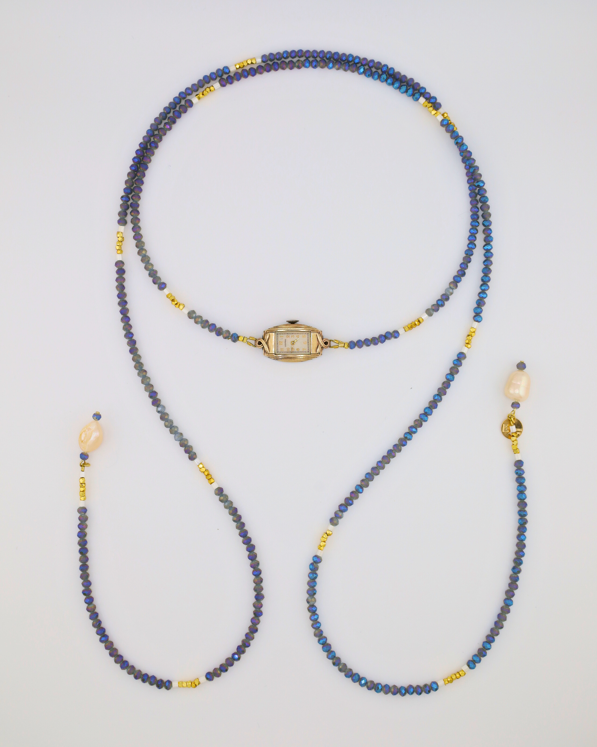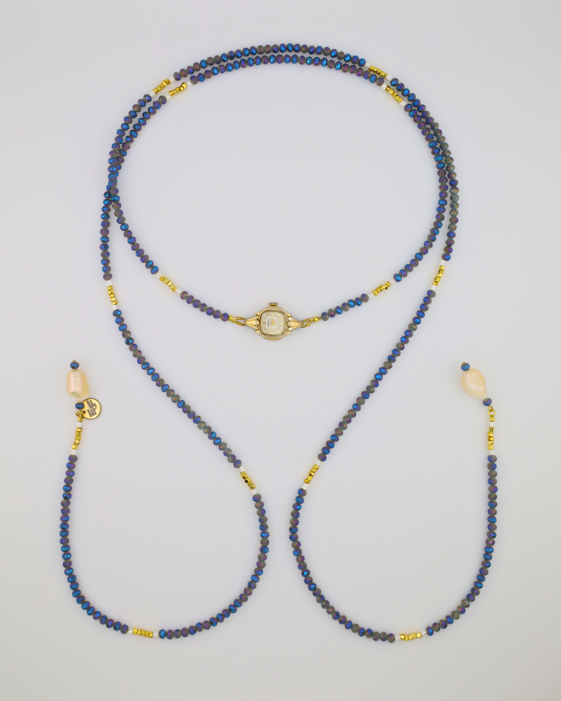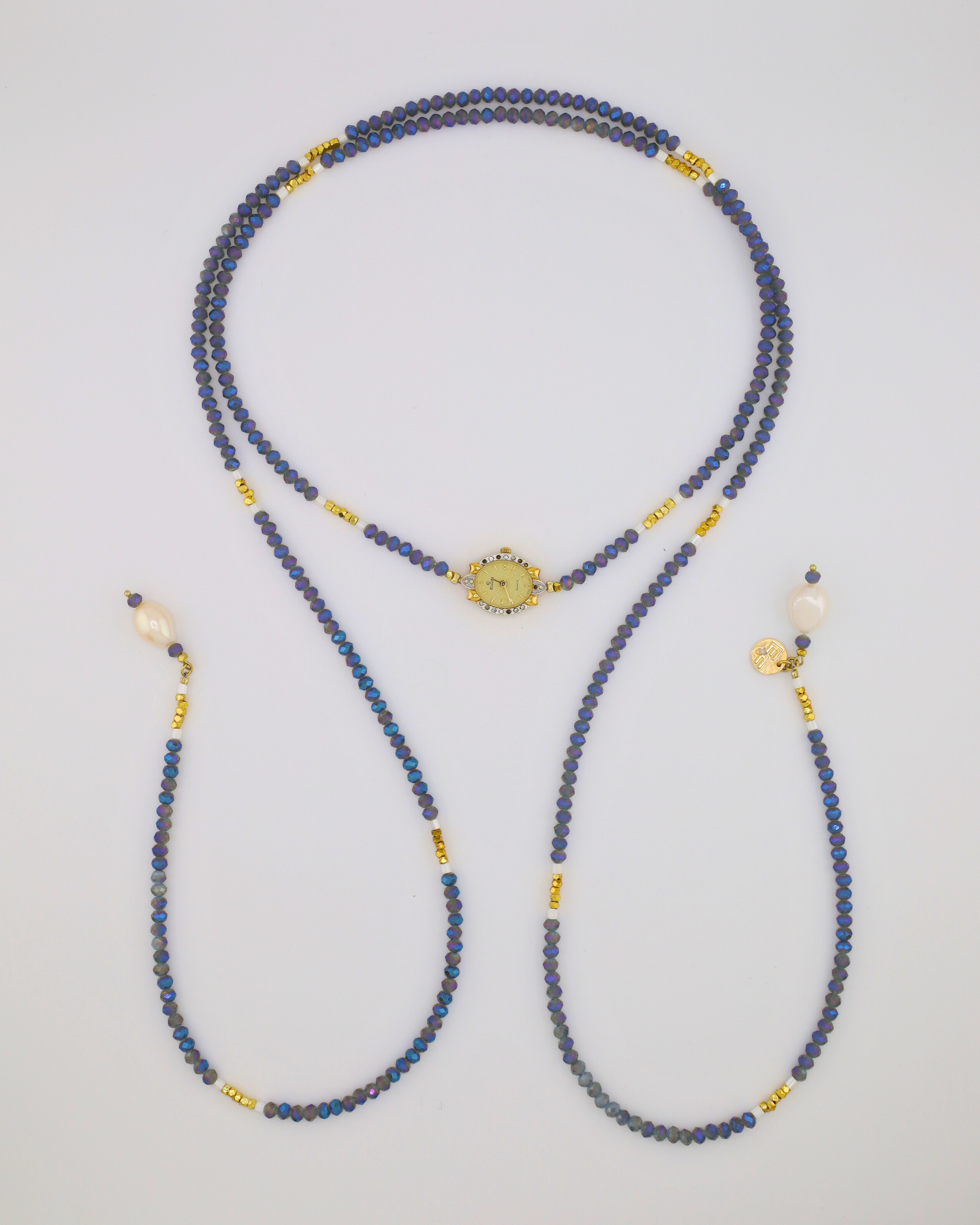 Designed and handmade by us with care, our new Índigo Watch Lariat Necklace offers a fresh take on our jewelry silhouettes. Crafted with carefully curated faceted crystals, pearls and gold hematites, this adjustable necklace features a vintage watch centerpiece, blending function and style in a unique, wearable piece. Its versatile lariat design allows you to layer it or wear it solo, adding a subtle twist to any outfit. Each watch centerpiece has its own character, with minor scratches or imperfections that make every necklace truly one of a kind, just like you.
