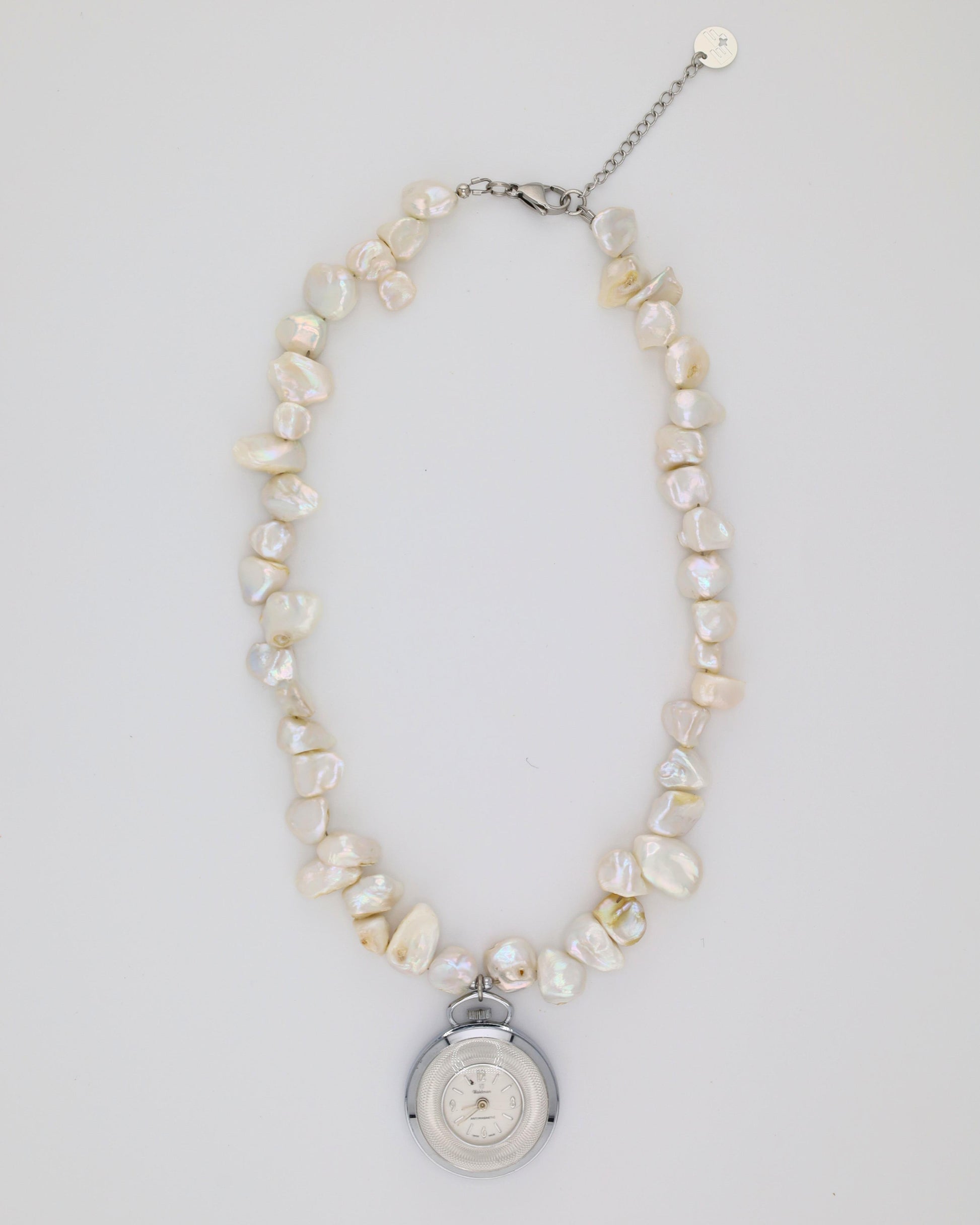 Designed and handmade by us with care, our new Marfil Pearl Necklace is a classic design. Crafted from durable stainless steel and pearls, this watch necklace features a vintage watch centerpiece, blending function and style in a unique, wearable piece. Each watch centerpiece has its own character and may have minor scratches or imperfections, making every necklace truly one-of-a-kind, just like you.