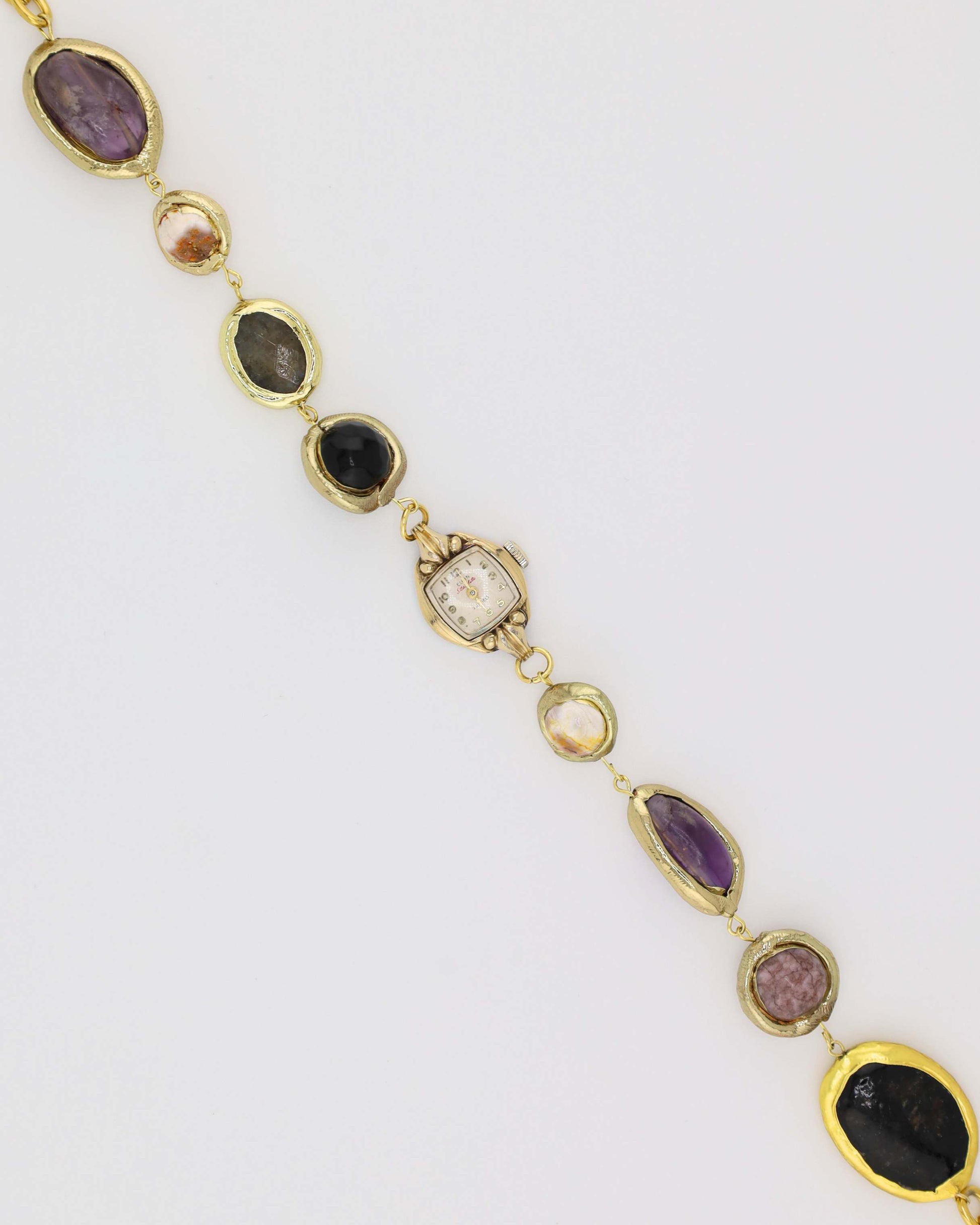 Designed and handmade by us with care, our new Mosaico Watch Choker blends stones of different shapes and tones for a unique, standout finish. Crafted from durable stainless steel and stones, this watch choker features a vintage watch centerpiece, blending function and style in a unique, wearable piece. Each watch centerpiece has its own character and may have minor scratches or imperfections, making every choker truly one-of-a-kind, just like you.