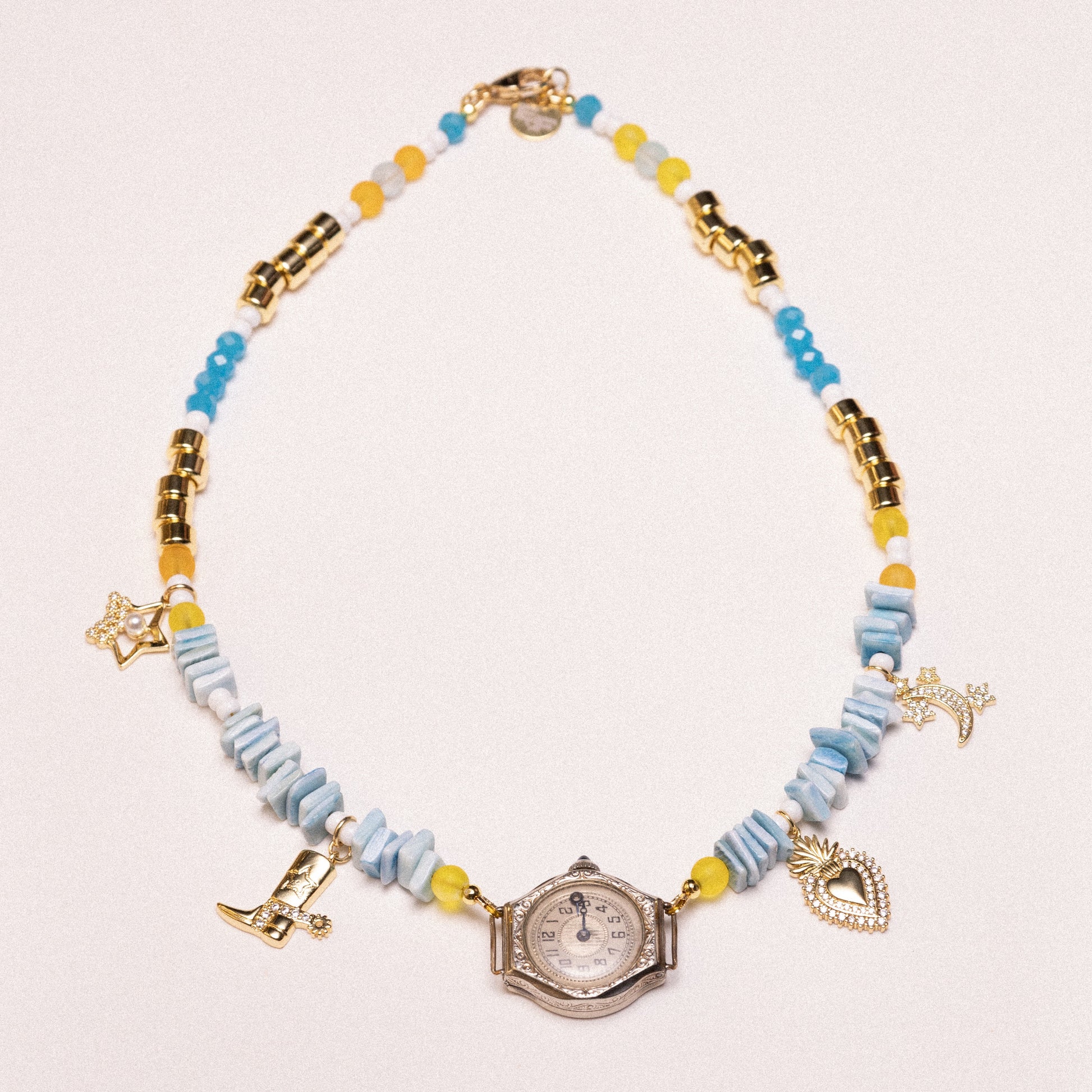 Crafted with a carefully assembled beaded base, this watch charm necklace features gold plated charms and a vintage watch face, making it a true conversation starter. While some of the watch faces may no longer tell time, they add a bold, unexpected twist to your look. Each piece is in excellent condition, with unique character that may include subtle imperfections—details that make it feel truly one-of-a-kind, just like you.