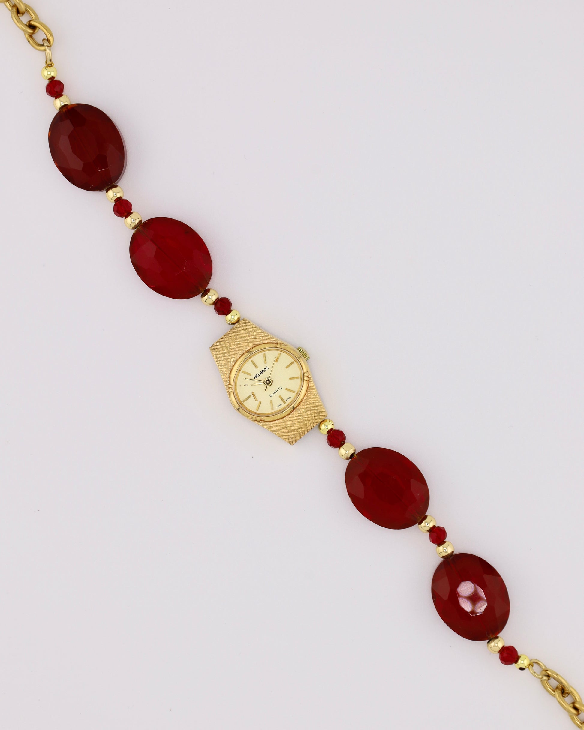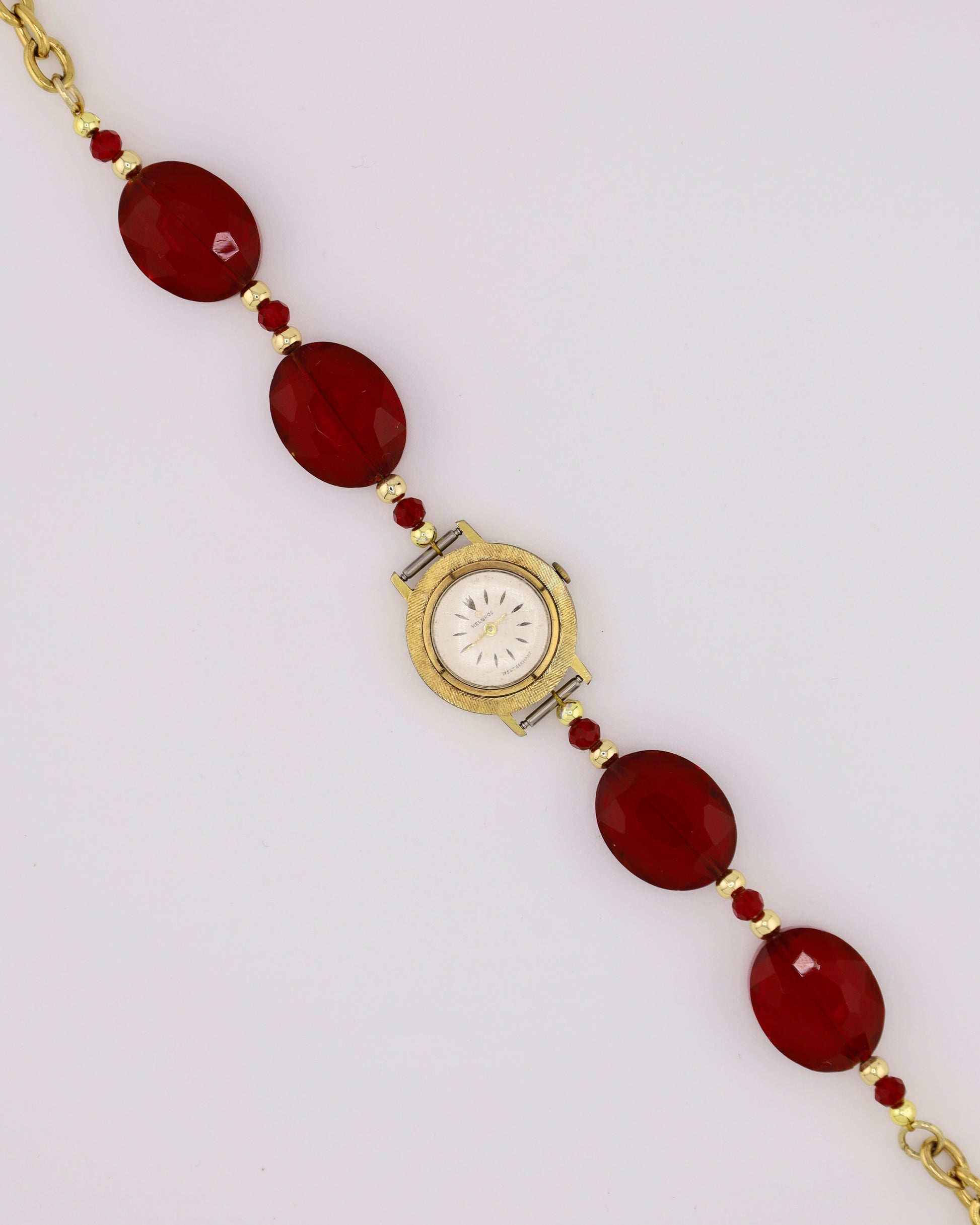 Designed and handmade by us with care, the Rubí Watch Choker is crafted from durable stainless steel and accented with faceted teardrop crystals and small gold hematites, creating a piece that stands out. Each watch choker features a unique watch centerpiece, showcasing the natural beauty and individuality of the materials. All watch centerpieces are in excellent vintage or pre-owned condition and may display minor scratches or imperfections, as shown in the photos—details that make every choker truly one-of-a-kind, just like you.