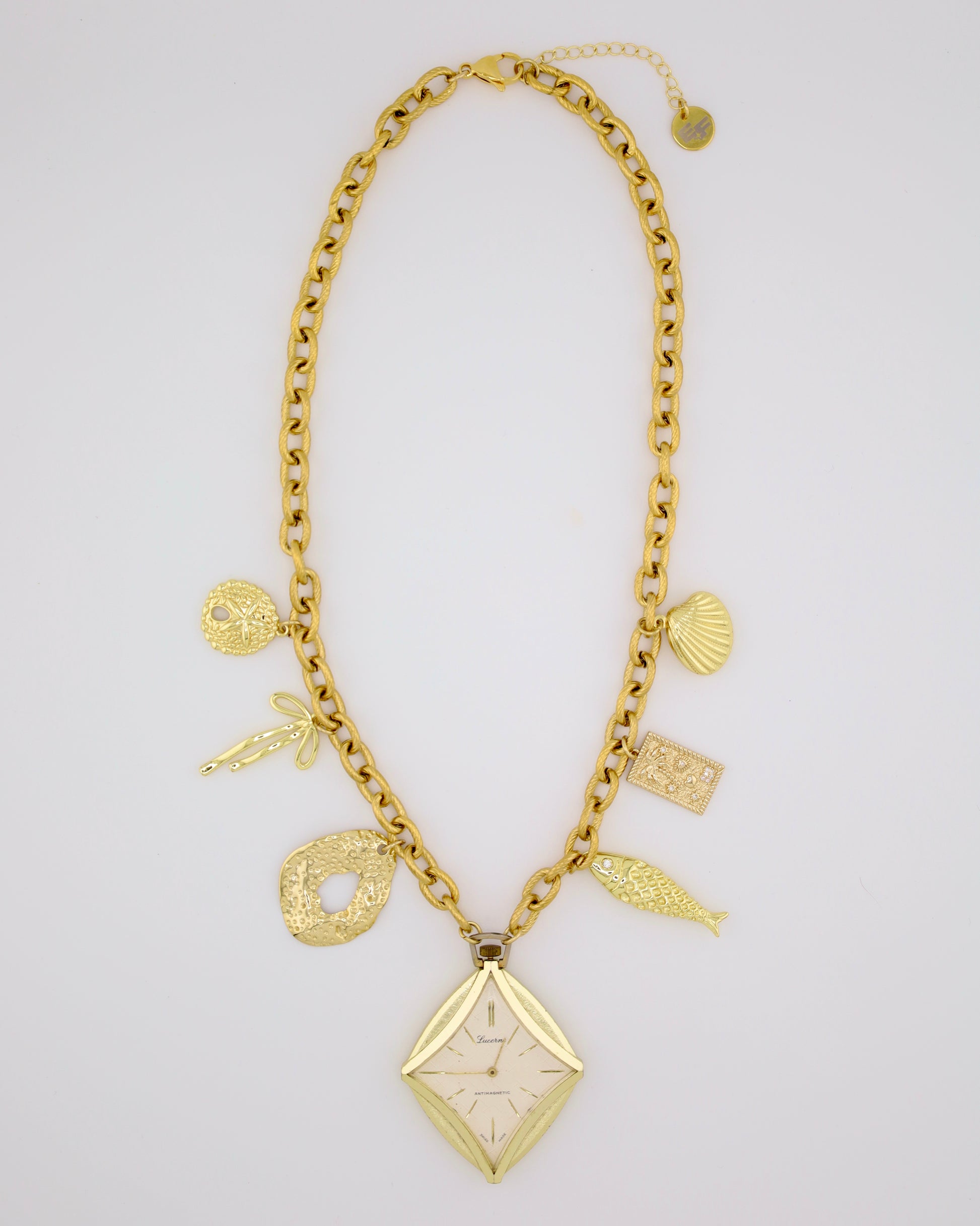 Crafted from durable gold plated chain, this charm necklace features a vintage watch and unique charms, making it a true conversation starter. While some of the watches may no longer tell time, they add a unique twist to your style. Each watch is in excellent vintage or pre-owned condition, with authentic character that may include minor scratches and imperfections, as shown in the photos—details that make it truly one-of-a-kind, just like you.